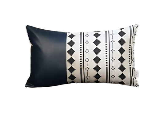 12" X 20" Black and White Diamond Fabric and Faux Leather Lumbar Throw Pillow Cover