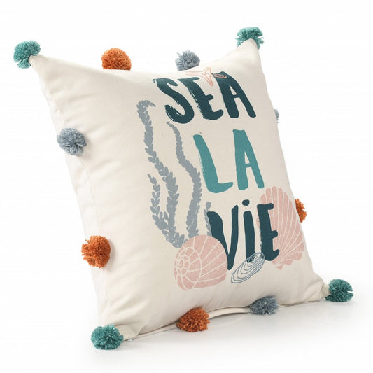 20" Natural Aqua And Gray Sea La Vie Seashells Throw Pillow with Pompoms
