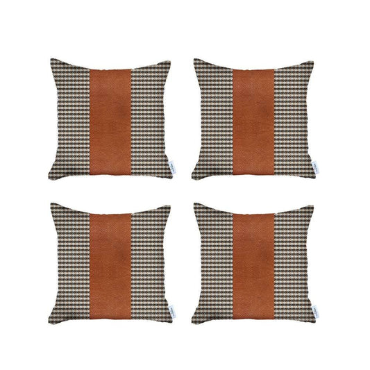 Set Of 4 Brown Checkered Faux Leather Pillow Covers