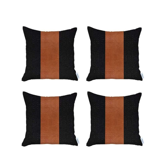 Set of Four 18" Brown And Black Faux Leather And Fabric Throw Pillow Covers
