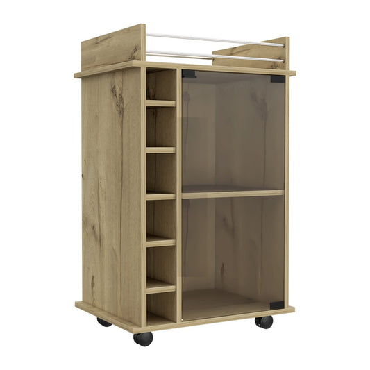 24" Oak Wood Rolling Bar Cart With Wine Storage