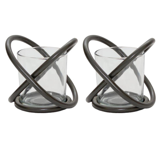 Set of Two Clear And Black Distressed Glass And Metal Tabletop Votive Candle Holders