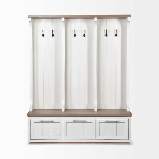 Brown Wood Cream Fabric Wrapped Seat Hall Tree With Storage