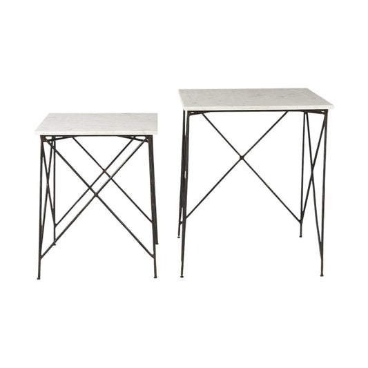 Set of Two White and Black Marble and Metal Square Nested Tables