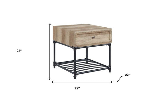 22" Sandy Black And Oak Manufactured Wood And Metal Square End Table With Drawer And Shelf