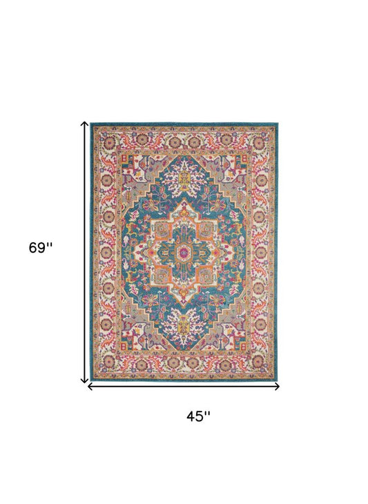 5' X 7' Orange Blue Teal Green And Beige Oriental Power Loom Stain Resistant Area Rug