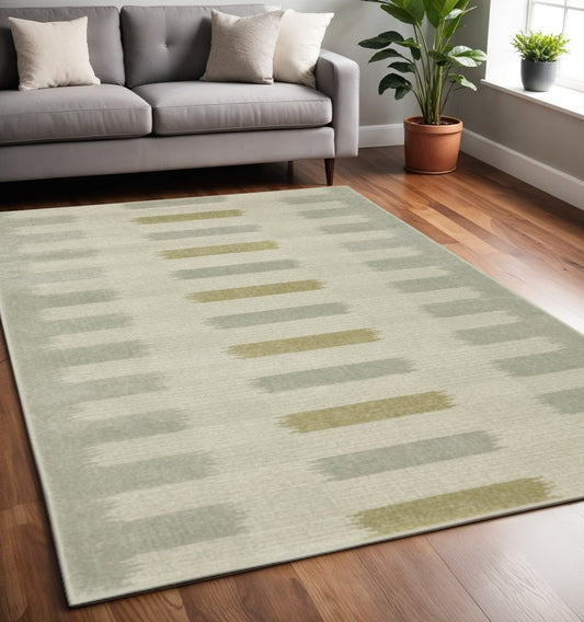 5' X 7' Beige Grey Gold And Green Geometric Power Loom Stain Resistant Area Rug