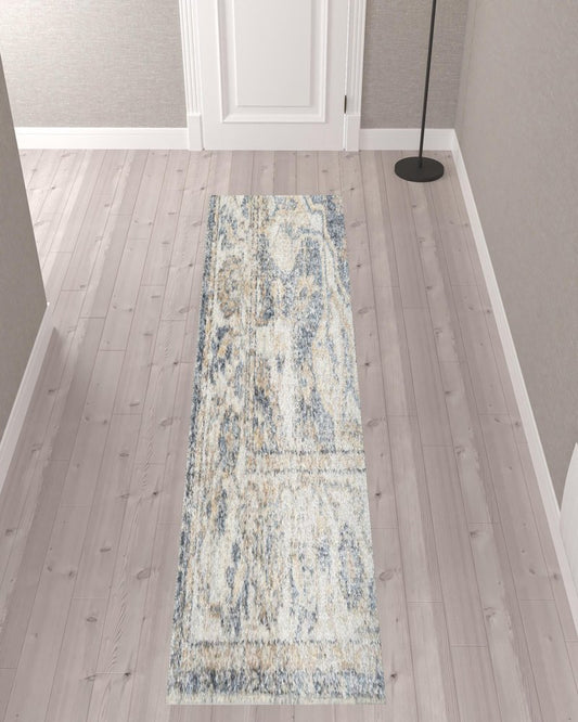 2' X 8' Ivory Navy And Gold Oriental Power Loom Stain Resistant Runner Rug