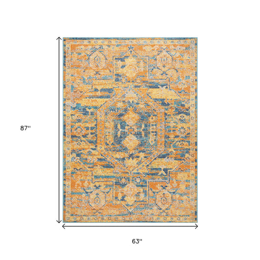 4' X 6' Teal And Gold Medallion Distressed Area Rug