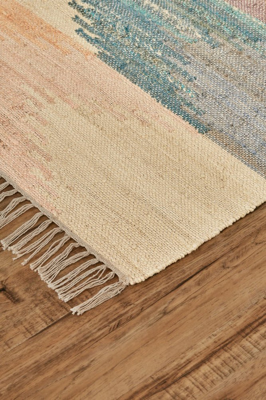 10' X 14' Tan Blue And Orange Geometric Dhurrie Flatweave Handmade Area Rug With Fringe