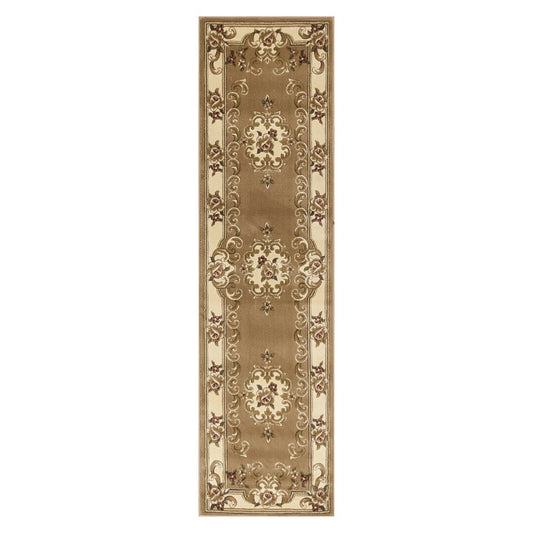 8' Beige Ivory And Brown Floral Medallion Runner Rug