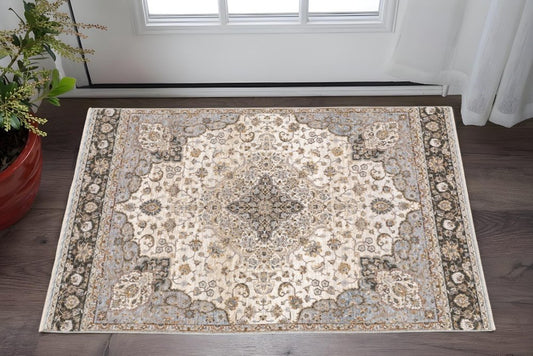 2' X 3' Ivory And Blue Oriental Power Loom Stain Resistant Area Rug With Fringe