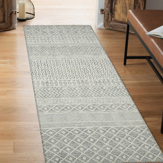 8' Gray And Ivory Geometric Flatweave Handmade Distressed Runner Rug With Fringe