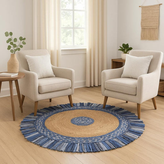 Regular price From $61.99 USDRegular priceUnit price perSale price From $61.99 USD4' Natural Red And Blue Jute Abstract Geometric Hand Woven Round Rug