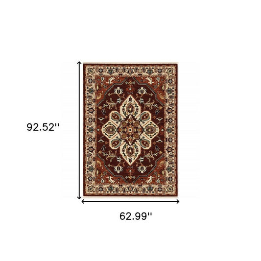 5' X 8' Red Ivory Orange And Blue Oriental Power Loom Stain Resistant Area Rug With Fringe