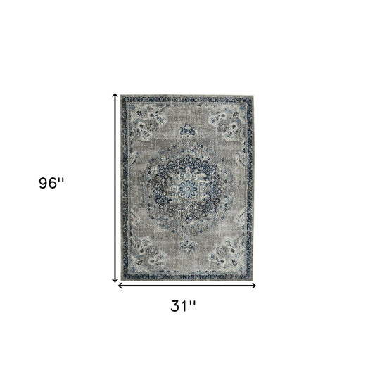 7' Sage And Slate Gray Wool Floral Medallion Runner Rug