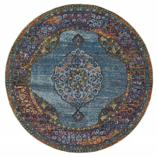 8' Blue and Beige Round Oriental Power Loom Area Rug