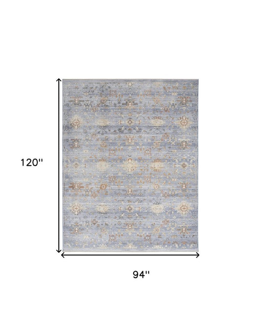 8' X 10' Blue and Ivory Oriental Power Loom Distressed Area Rug With Fringe