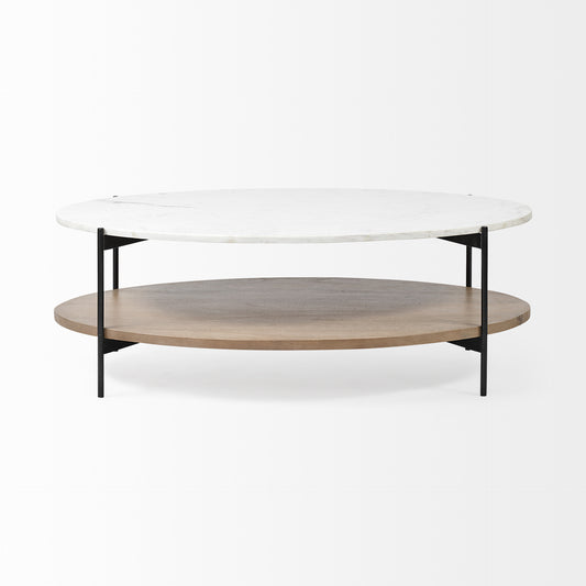 48" Brown and Black Genuine Marble and Metal Oval Coffee Table With Shelf