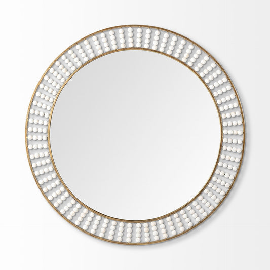 42" Round Gold Metal Frame Wall Mirror With White Wood Beads
