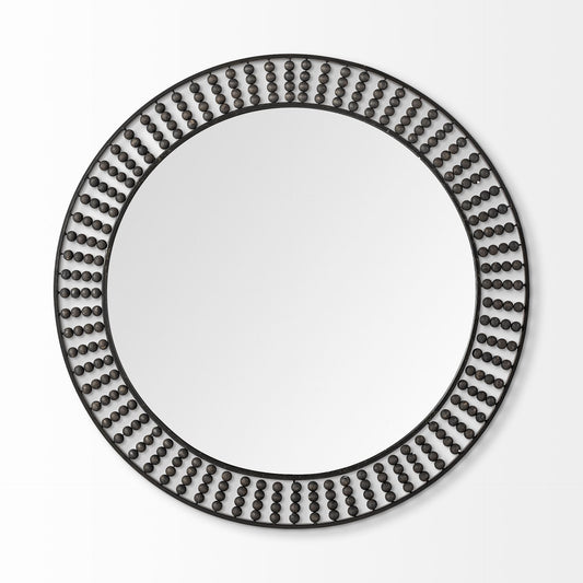 42" Round Black Metal Frame Wall Mirror With Wood Beads