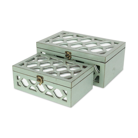 Set of Two Green Mirrored Glass And Solid Wood Box With Lid