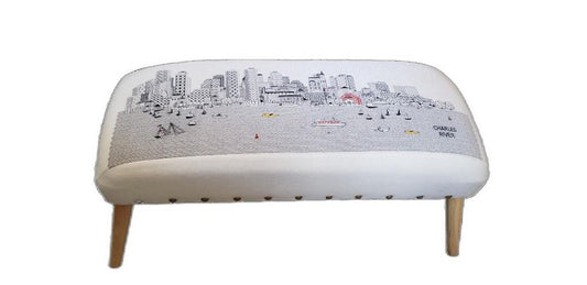 38" Cream And Natural Boston Daytime Skyline Embroidered Ottoman