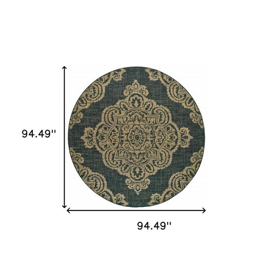 8' X 8' Black and Tan Round Oriental Stain Resistant Indoor Outdoor Area Rug