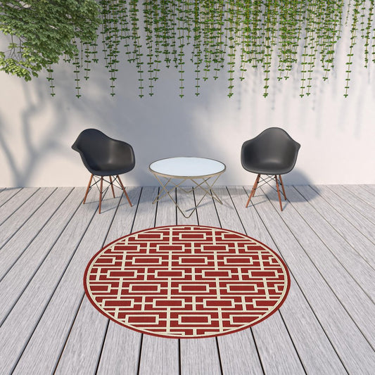 8' X 8' Red and Ivory Round Geometric Stain Resistant Indoor Outdoor Area Rug
