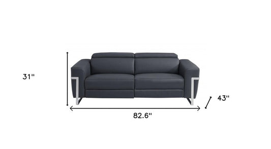 83" Dark Gray Italian Leather USB Reclining Sofa With Silver Legs