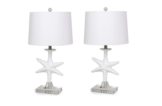 Set of Two 28" Clear and White Coastal Star Fish Table Lamps With White Drum Shades