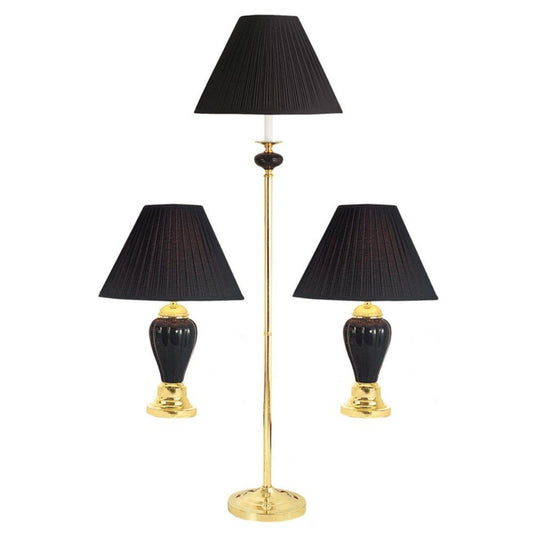 Set Of Three 64" Gold Ceramic Bedside Floor and Table Lamp Set With Black Empire Shade