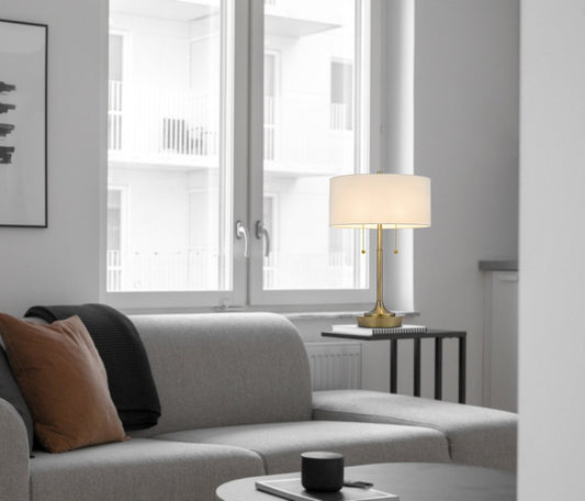 20" Antiqued Brass Metal Two Light Table Lamp With White Drum Shade