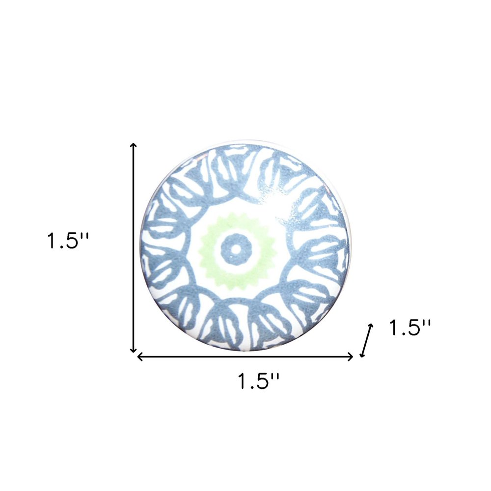 Give your drawers or cabinets a facelift with this set of twelve white and light blue metal and ceramic drawer pull knobs. Improve the look of your old boring or builder grade furniture and cabinetry with these high quality round knob traditional style knobs. Featuring a charming flower botanical theme, these knobs blend functionality with elegance. Each knob is crafted from durable materials, ensuring longevity while adding a touch of sophistication to your decor. Screws are included for easy installation. 1.5-inch h x 1.5-inch w x 1.5-inch d.