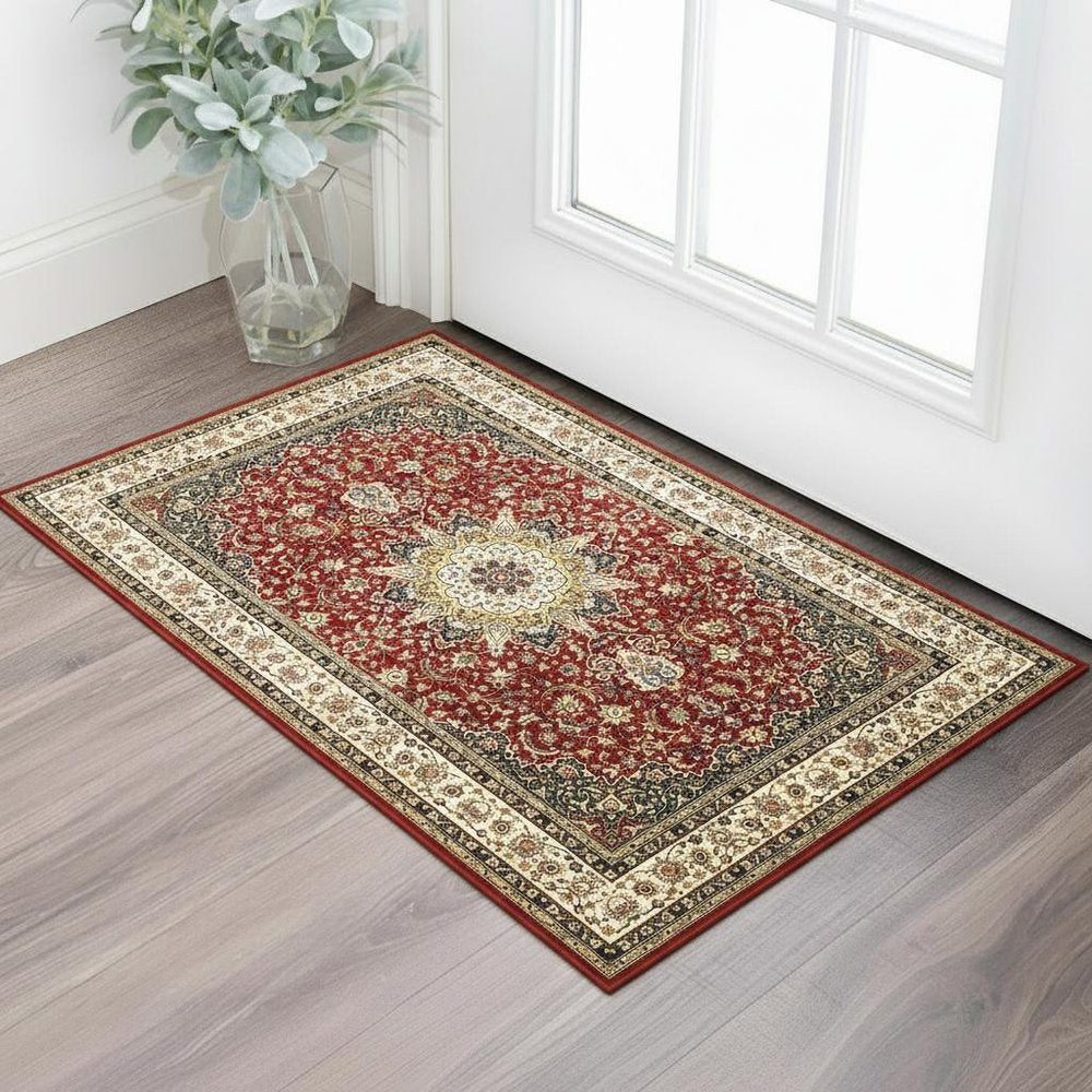 Set an inviting tone in your space with this 2-foot x 3-foot red and ivory area rug. Built to last, this rug crafted from polypropylene fibers is known for its durability and long lasting appeal. Rugs are a great way to showcase your style, hide imperfections, warm your home and reduce noise. This smaller sized, traditional styled rug is just what you need for your walkway, bedside, in front of door, cabinet, refrigerator, or chair. 22.44-inch h x 35.83-inch w x 0.32-inch d.