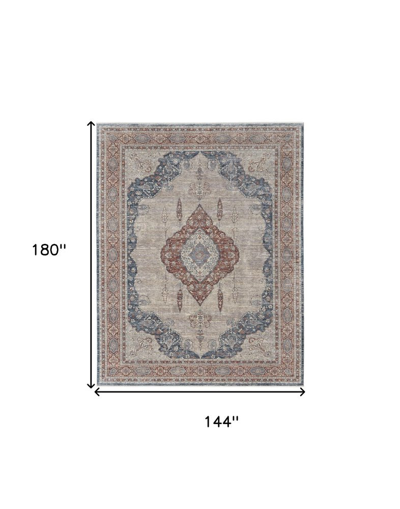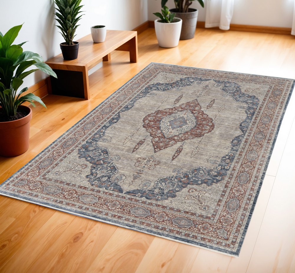 10' Gray Red And Blue Floral Runner Rug With Fringe