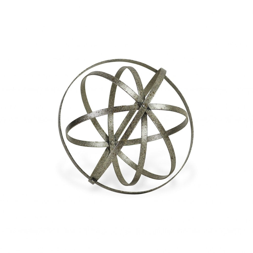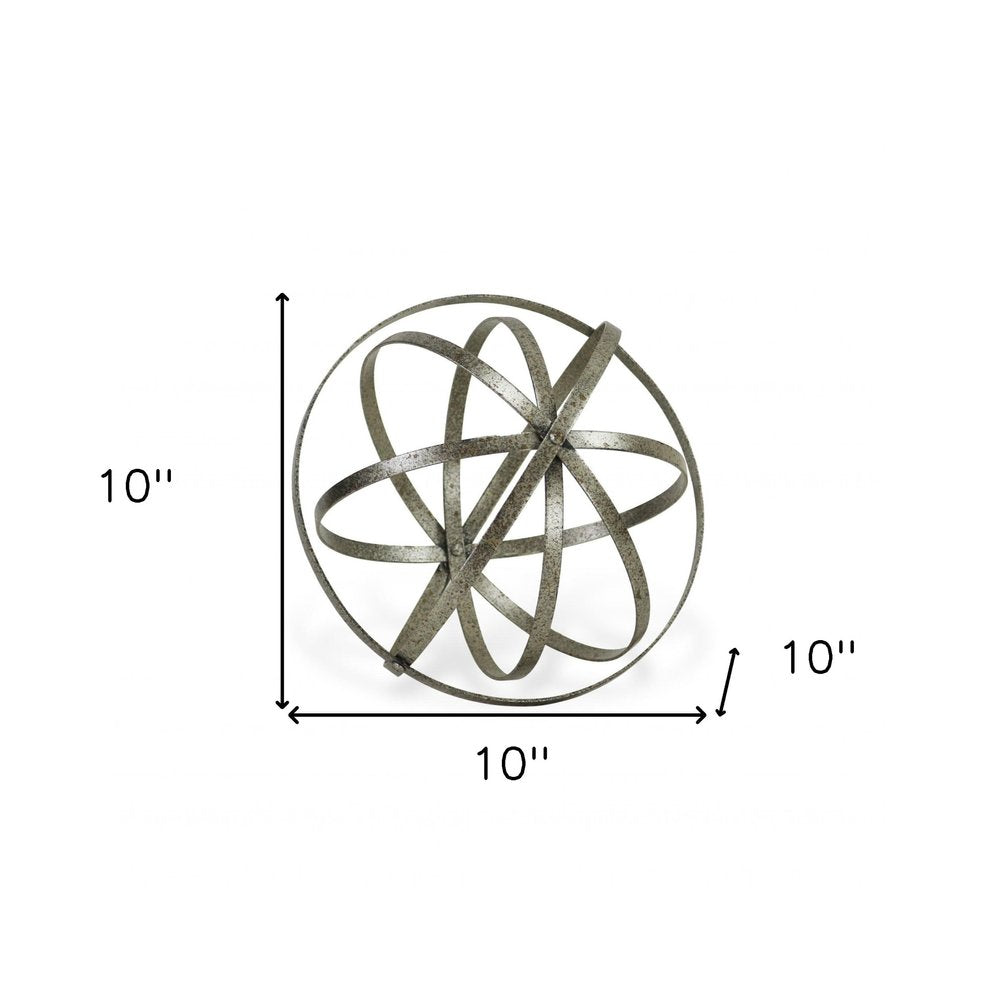 Unique and decorative, this 10-inch silver metal hand painted decorative orb tabletop sculpture will leave a lasting impression. This silver hued piece represents high quality, expertly made from high grade metal. Great to use on its own or mix with other decorations for the perfect look. 10-inch h x 10-inch w x 10-inch d