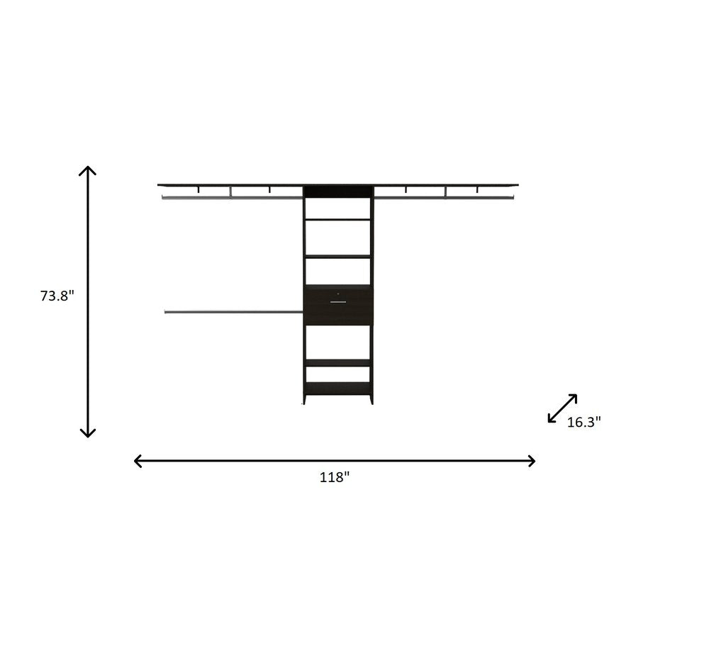 Add a designer style closet, without the designer, when you install this 74"H Black and Stainless Adjustable Width Create a Closet System. This ready made storage and organization system will allow you to create a closet in a niche or add into an existing closet space for a high end look. This system includes an adjustable black top shelf that spans 70" - 118" wide and features three closet rods, five open cubby shelf spaces, and a single easy pull out drawer. 73.8" H x 118" W x 16.3" D