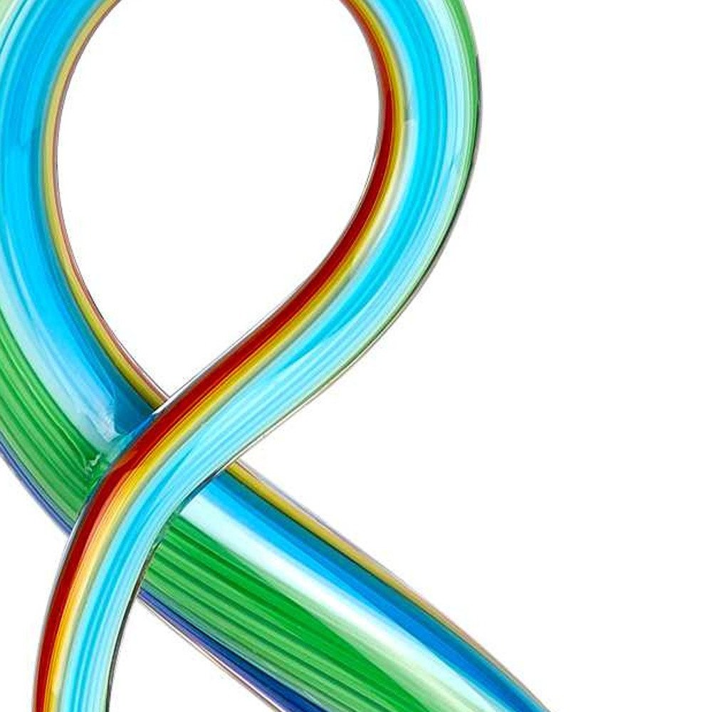 Bring some sizzle to your space with this eye-catching 12-inch clear and rainbow abstract art glass sculpture. A clear crystal base hosts this vibrant abstract musical note design. Infused with shades of blue, yellow, red, and green, this beautifully colored piece is made from sparkling high grade Murano style glass. This sculpture makes a great tabletop accent for your coffee table, counter, bookshelf, mantle, or even dining table. 12-inch H x 3-inch W x 5.5-inch D