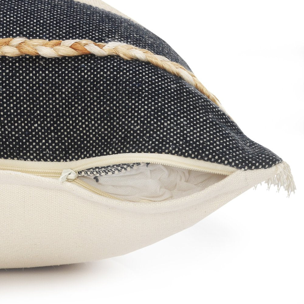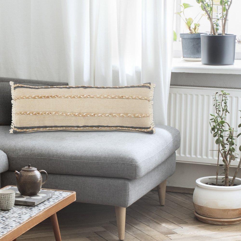 The 14" x 36" black tan and taupe jute striped zippered pillow is the perfect decorative accessory for your home. This soft and durable decorative pillow is expertly made of high grade, long lasting jute in a black tan and taupe coloration. For anyone that loves to decorate or accent their space with color and texture. A great decorative accessory for your favorite chair, to accent your sofa, or to use as part of your bed ensemble. 14" H x 14" W x 36" D