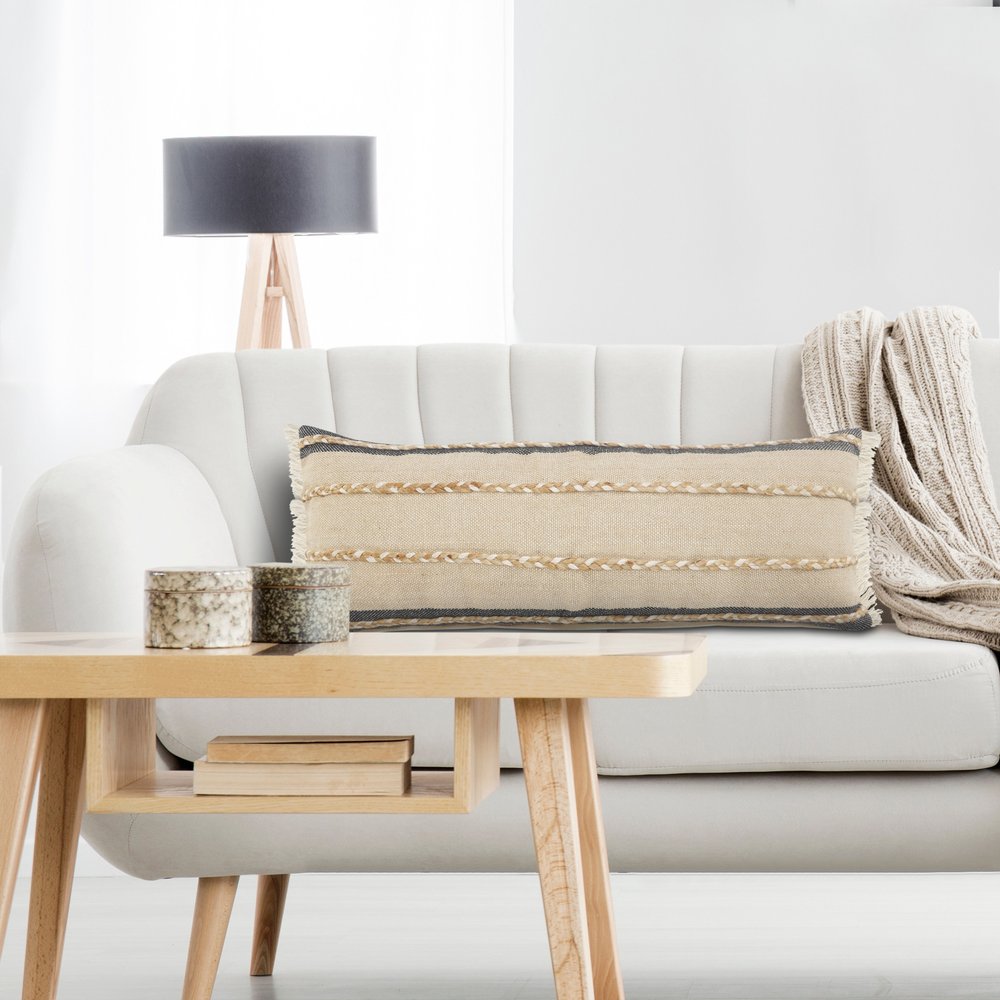 14" X 36" Black Tan And Taupe Jute Striped Zippered Pillow
