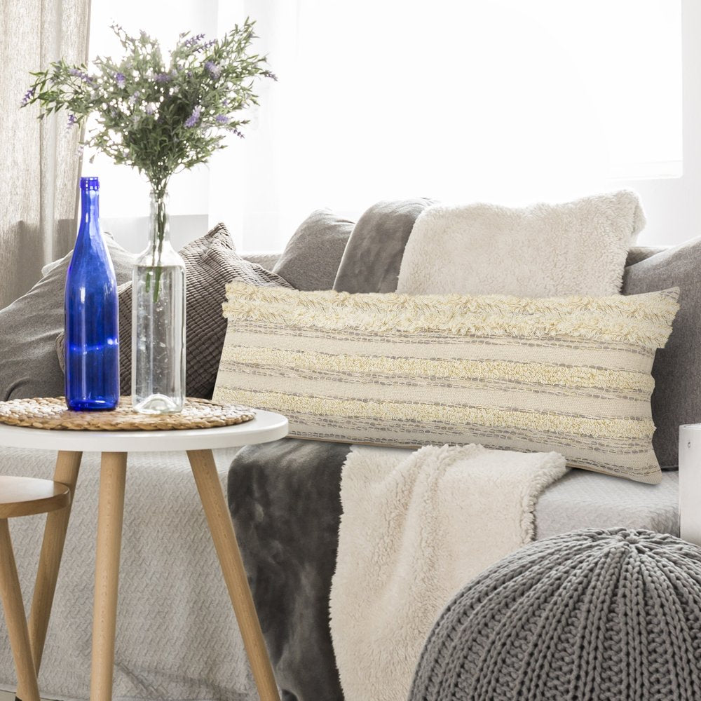 The 14-inch x 36-inch cream gray and tan cotton striped throw pillow is the perfect decorative accessory for your home. Durable cream, gray, and tan cotton has been used to give this pillow a beautiful look that will stand the test of time. This soft polyfill filled pillow not only is decorative but made to be comfy and cozy all day long. Decorative pillows are a great way to change up the look and feel of your space easily and quickly. A great decorative accessory to add color and dimension to your favorite chair, accent your sofa, or to use as part of your bed ensemble. 14-inch h x 36-inch w x 7.5-inch d.