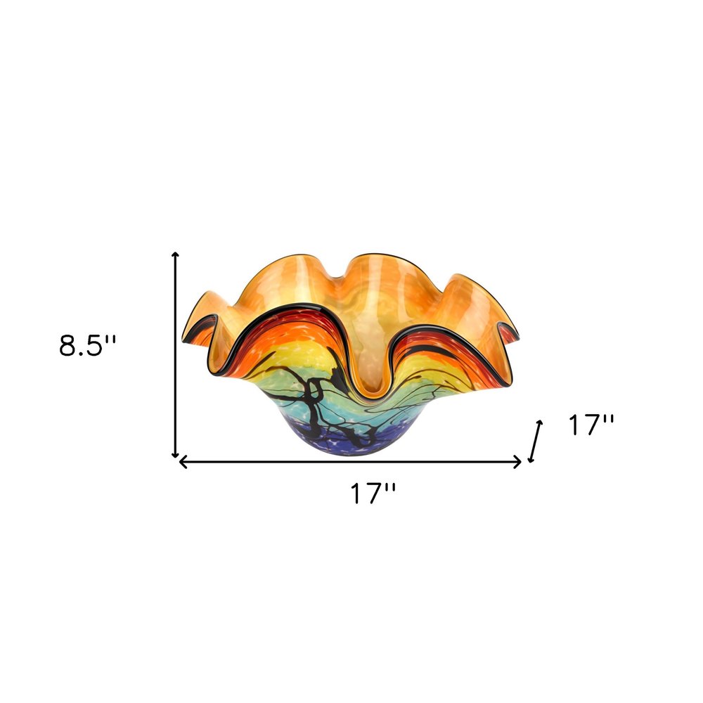 17" Red Yellow and Green Wavy Glass Centerpiece Bowl
