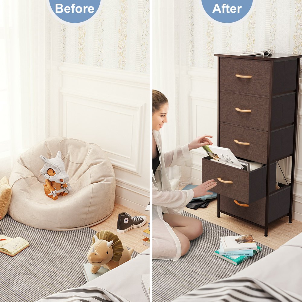 Enhance your room into a visually delightful and highly functional space with this 18" brown steel and fabric five drawer standard chest. The space saving design of this standard chest makes it a great choice for space challenged spaces or small walls within your room. Equipped with five easy open drawers for practical and good looking clothing storage. Its a high quality piece, made from high grade steel and fabric. Removable drawers give this chest flexibility and multi-functionality. 46.1" H x 17.7" W x 11.8" D