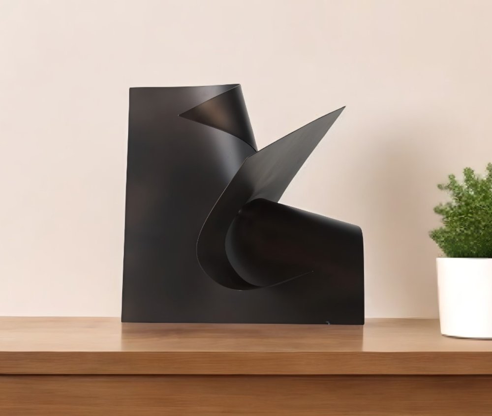 The perfect combination of art and design, this Contempo Antiqued Gold Abstract Sculpture will elevate any space in your home. This decor piece is made from solid metal and has a very contemporary art inspired shape to it. There is one metal sheet in dark and varying shades of antiqued black that is twisted in a very flowy and abstract wave pattern. The simple yet unique design is perfect for centerpiece decor, desk top, bookshelf decor, or even kitchen decor. 18" H x 18" W x 18" D