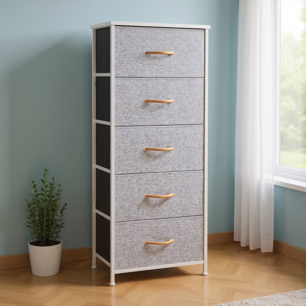 Add personality to your bedroom style and a feeling of coziness with this 18" gray and white steel and fabric five drawer standard chest. The space saving design of this standard chest makes it a great choice for space challenged spaces or small walls within your room. Equipped with five easy open drawers for practical and good looking clothing storage. Its a high quality piece, made from high grade steel and fabric. Removable drawers give this chest flexibility and multi-functionality. 46.1" H x 17.7" W x 11.8" D