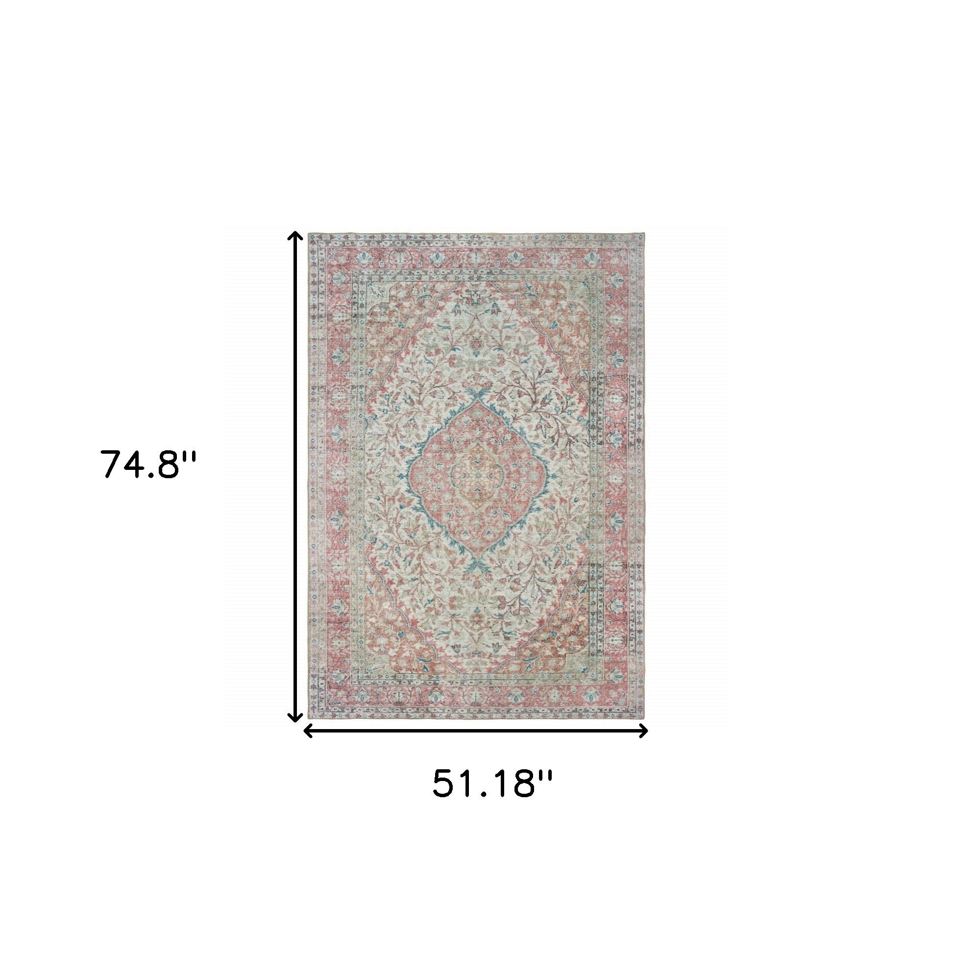 Lend an essence of imperial elegance in your living space with this mesmerizing Ivory and Pink Oriental Area Rug on the floor that features a pastel pink color palette to harmonize in any traditional setting. Shadowing a soft pink and ivory eye-like medallion motif in the center with eclectic floral vines all around to create a visually pleasing sight. Ideal for indoor usage, this rug is made of machine-woven polyester and chenille with a cotton backing to ensure its durability and resist stains for years to come. The deep pile construction accentuates a hand-knotted appeal that feels more dimensional and super soft under the feet for a rich and plush appearance. Combining traditional patterns and on-trend colors in a compact design, this area rug would effortlessly blend in with your traditional decors. 0.08” x 90.55” x 118.11”