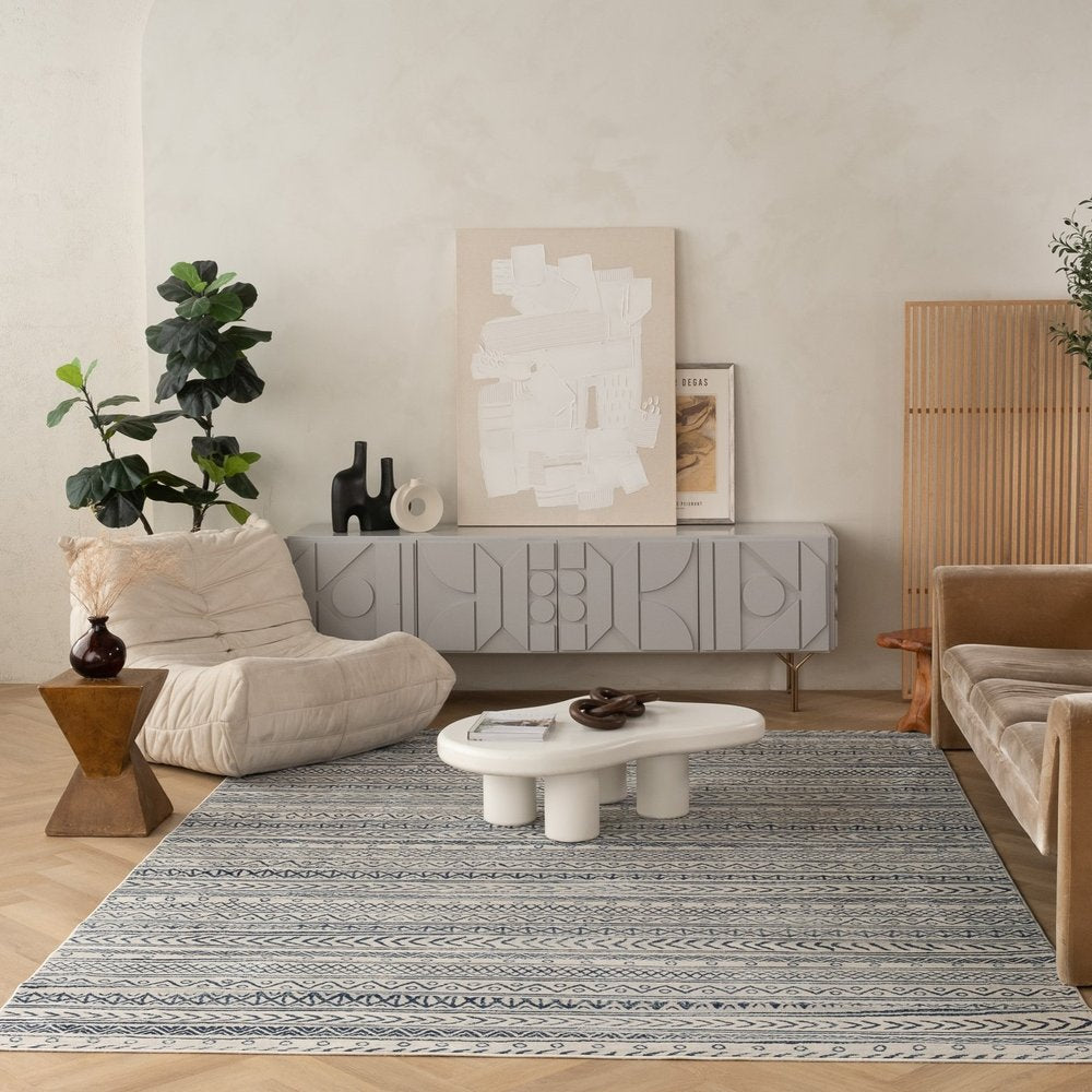 Encompassing the details of bohemian styling in a sophisticated fashion, this Navy Blue Decorative Stripes Area Rug makes its place in any contemporary or casual setting. The intricately decorative patterns in navy blue are confined in fine stripes over an ivory base to create a hypnotizing effect that allures the gaze. Upholding the richness of Turkish craftsmanship, this rug is made of 100% inherently stain-resistant polypropylene fibers which is not only easy to clean but also super durable to last for ages in the high traffic areas of your home. Besides its pristine look and nonchalant vibe, this rug offers a soft and smooth layer under your feet due to its high pile construction that adds to the surface interest. Simple and soothing in its elegant hues, this beautifully subtle area rug will induce a calm and relaxed environment into your living space while complementing the aesthetics of your modern interior. 66” x 45” x 0.4