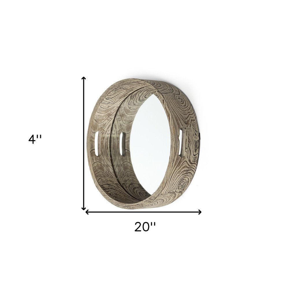 This 20-inch light brown round wood indoor outdoor serving tray with handles will add a beautiful decorative accent to your decor. This gorgeous round serving tray is made from genuine wood providing both durability and a classic look. Designed with handles for easy transport and convenience. Food safe and versatile, this serving tray is sure to please. 20-inch H x 20-inch W x 4-inch D
