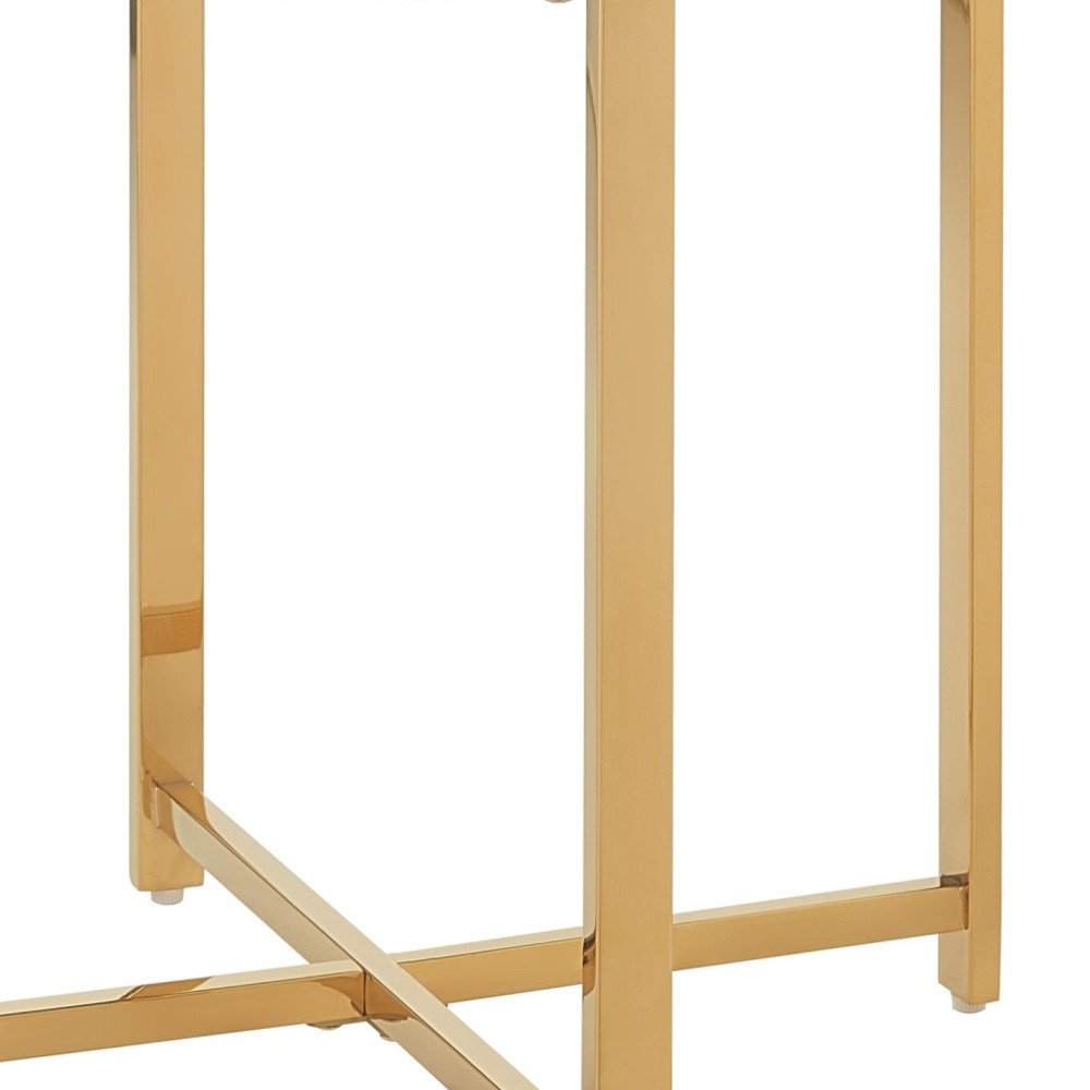 Distinctive in style the 22" gold glass round mirrored end table radiates a versatile charm. A solid gold stainless steel frame is finished off with a matching gold glass seat, giving this table a chic monotone look. Reflective pieces of mirrored glass give this table a glamorous and unique look. Side tables are a great way to flank your sofa, use as an accent next to your favorite chair, or can even be used bedside. You can also use it as an entryway table to hold your keys. 21.6" H x 21.6" W x 21.6" D